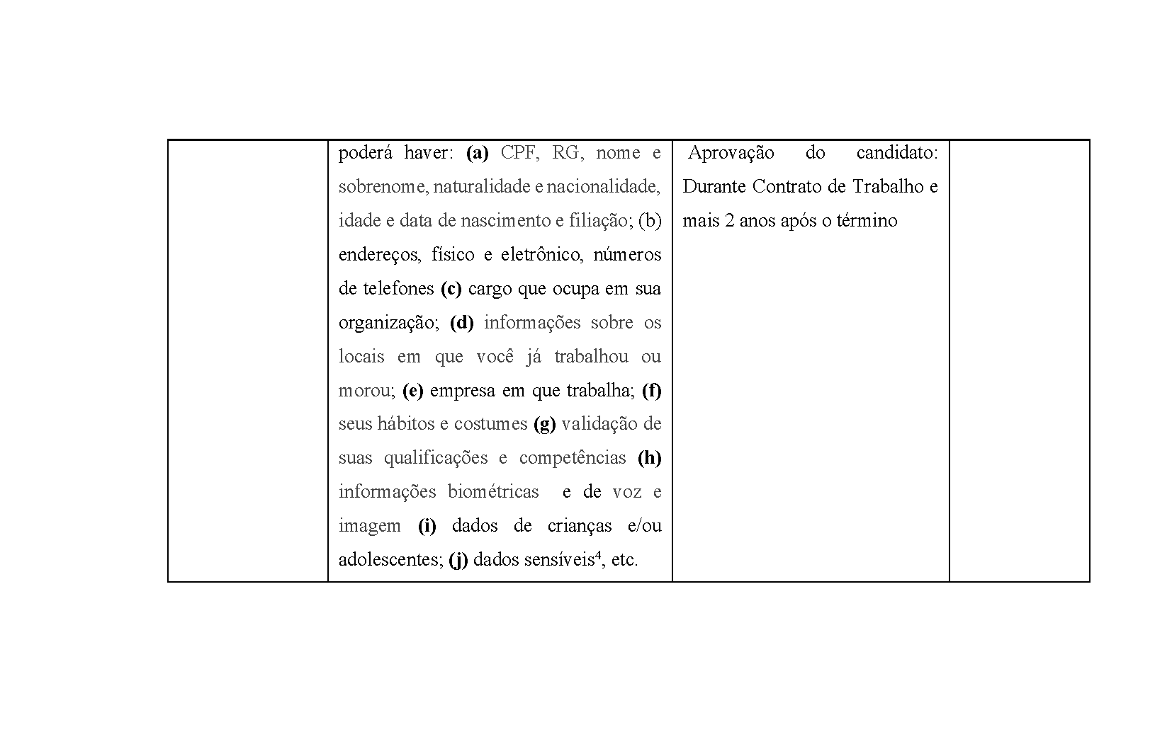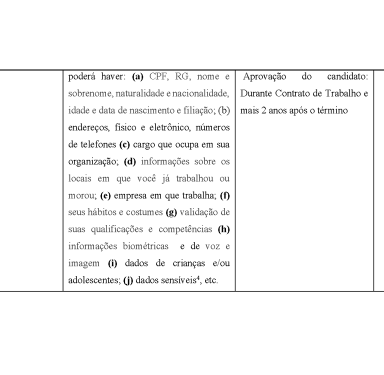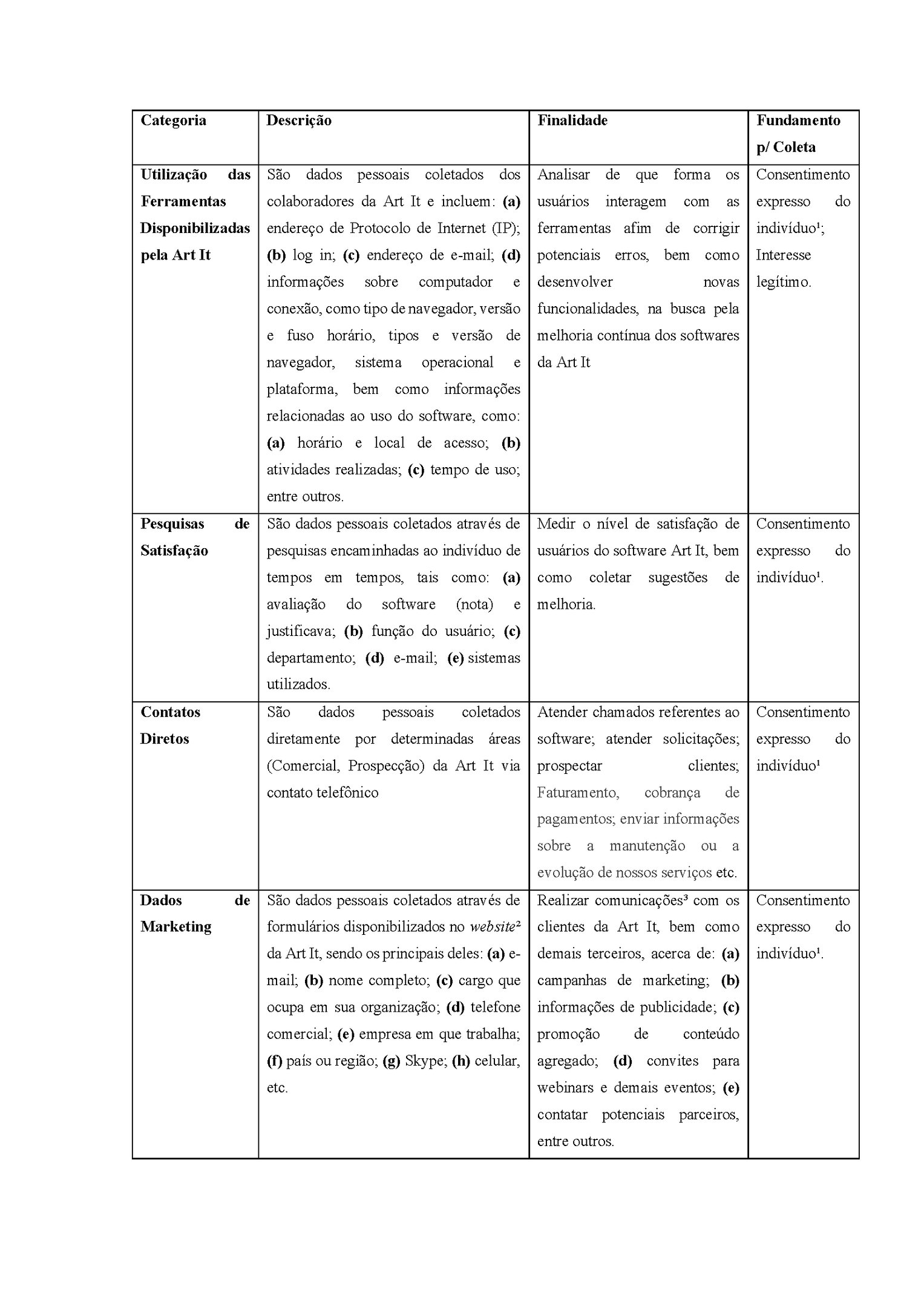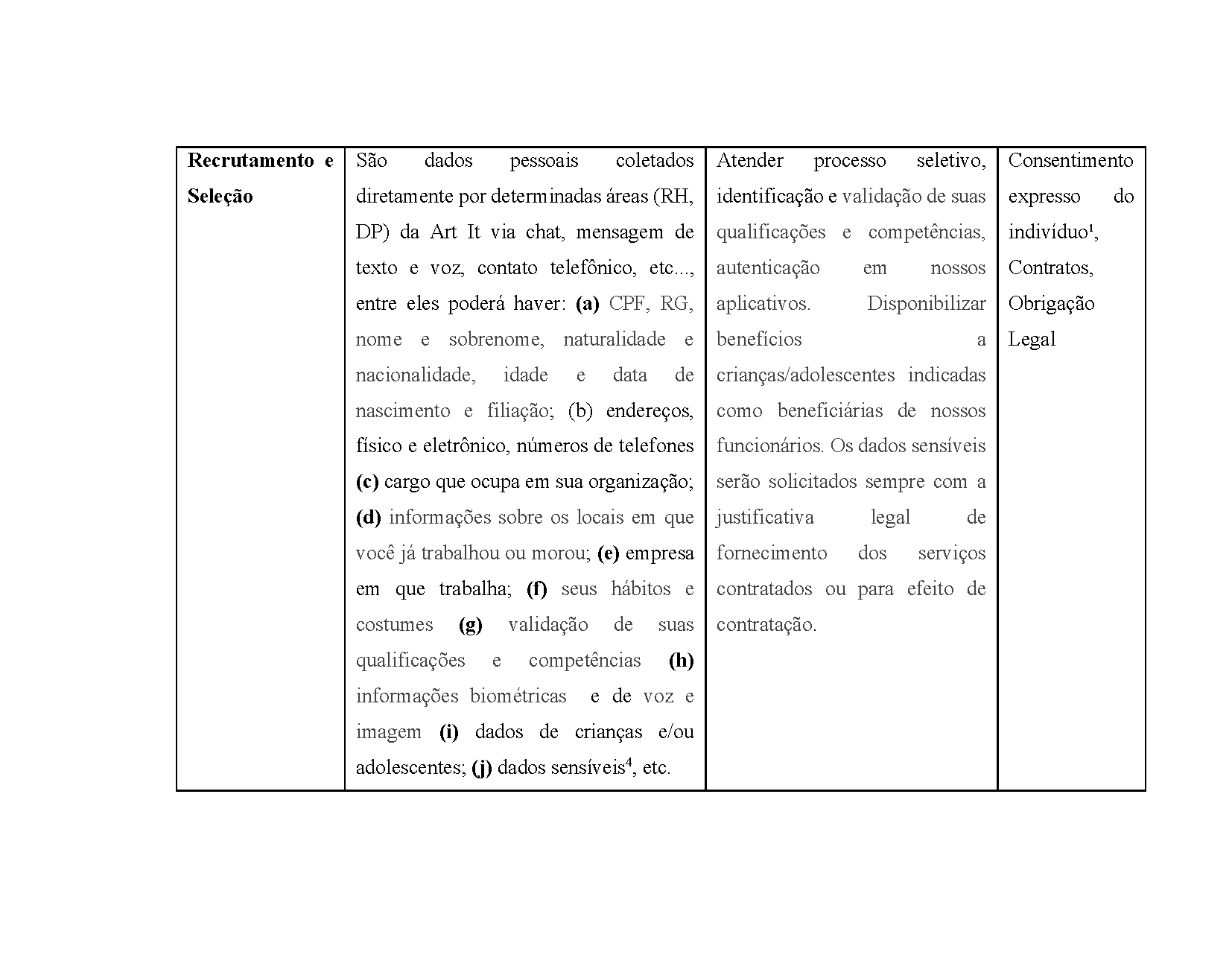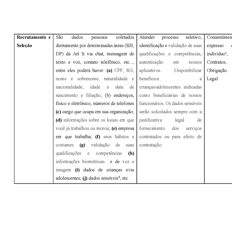 Consent is understood as a clear and unequivocal declaration by a person who agrees with the use of their data for the purposes proposed by the company. Ex: “I agree to provide my personal data (a) CPF, ID, name and surname, place of birth and nationality, age and date of birth and affiliation; (b) addresses, physical and electronic, telephone numbers (c) position I hold in the organization; (d) information about the places I have worked or lived in; (e) company I work for and have worked in the past; (f) my habits and customs (g) my qualifications and skills (h) my voice and image biometric information, to that ART IT can use them in the best way it sees fit, including contacting me or answering any questions or interests in the products/services that I have.”