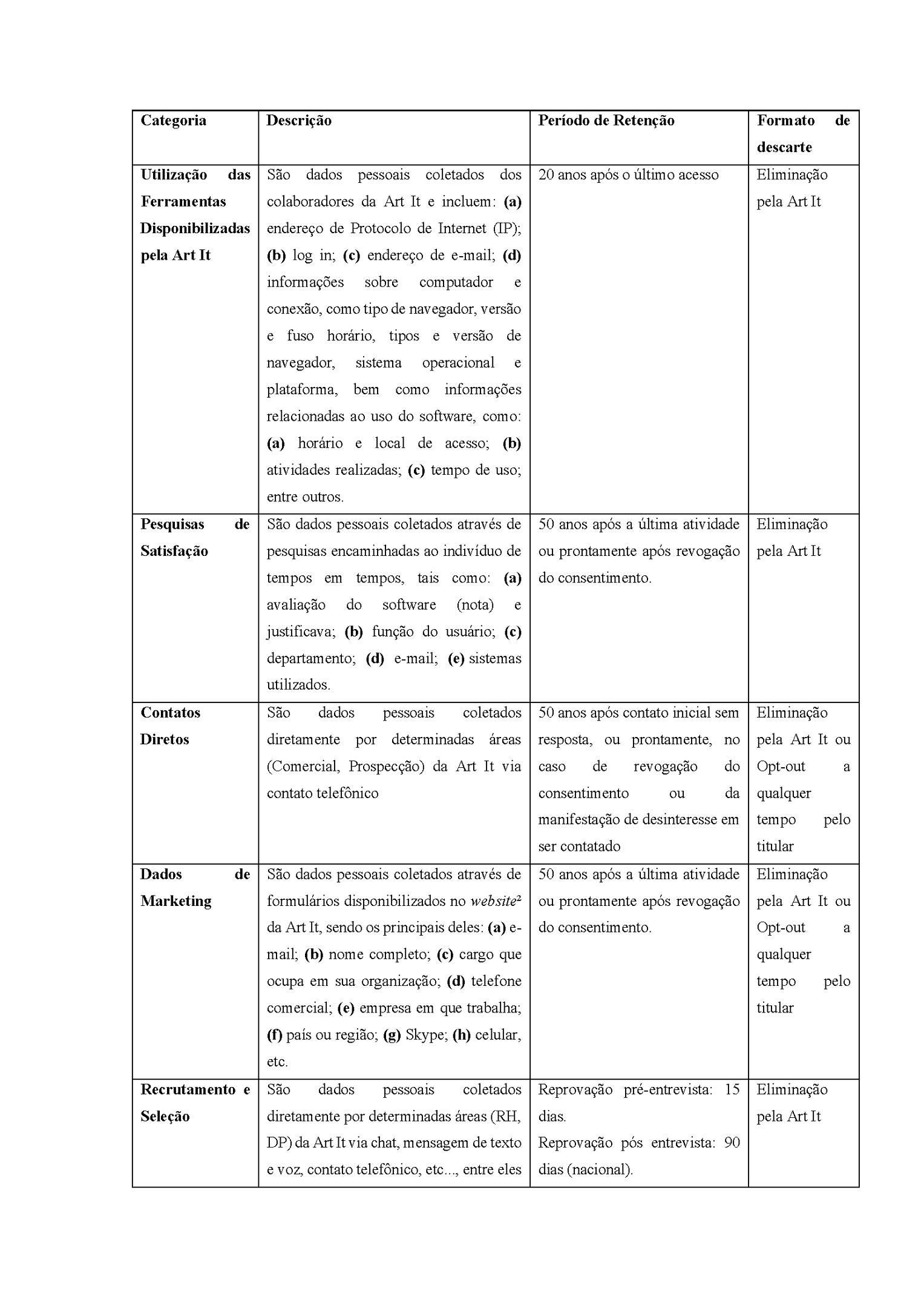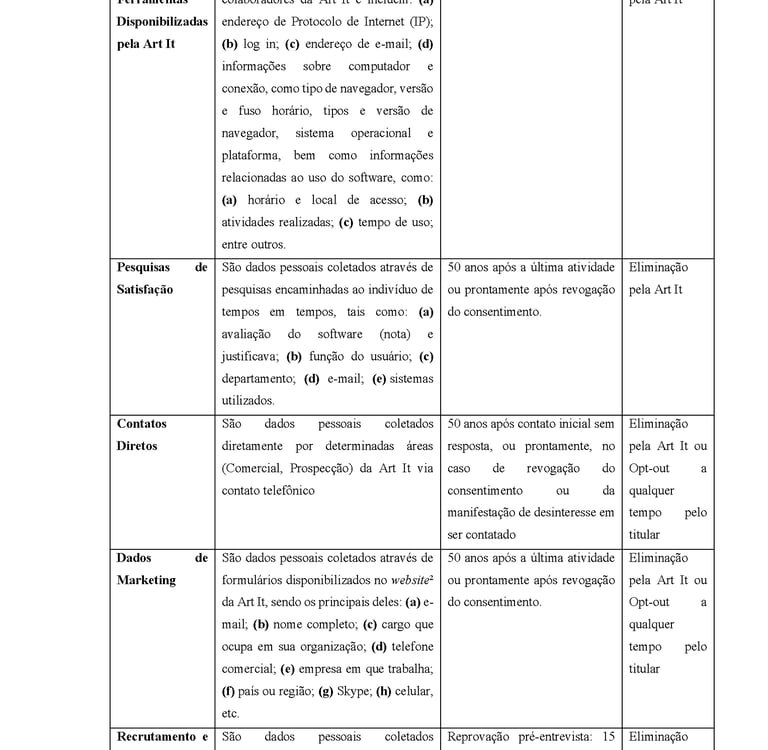 In the event of a request for the deletion of personal data from the ART IT database, if it is found that there is a need to maintain such personal data, due to legal, contractual and regulatory obligations, this will be informed to the holder and the request will be denied.